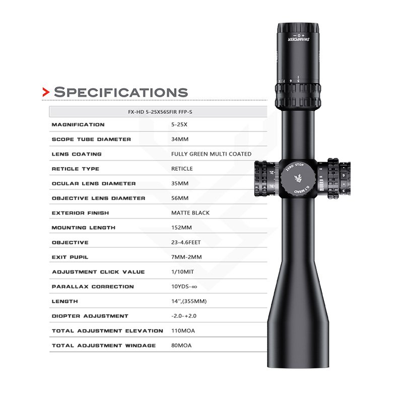 Rugged Construction The Swampdeer FX-HD 5-30x56SFIR FFP-S Rifle Scope achieves IP67 waterproof/ fogproof ratings, ensuring reliability in harsh environments. The zero-stop turrets with tactile clicks simplify rapid zeroing, reinforced by an integrated levelling base for stability. User-